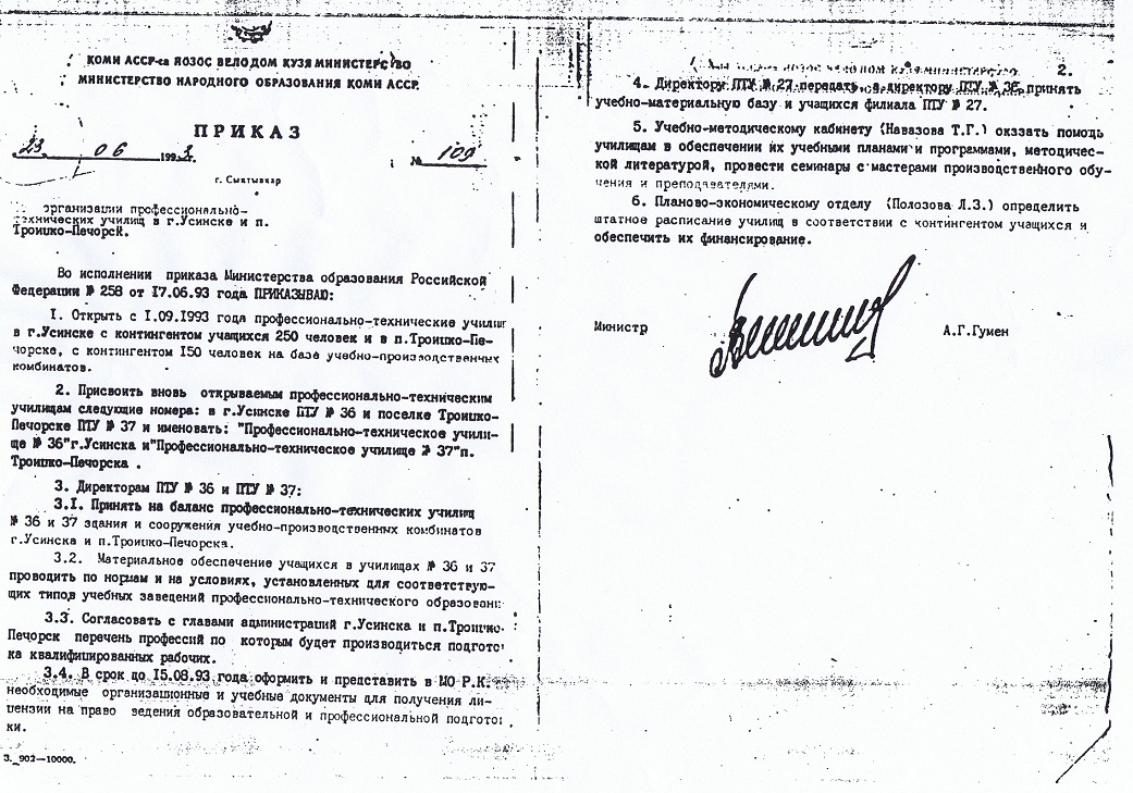 В 1991 году для Межшкольного учебного производственного комбината (МУПК) выделили бывшее здание школы № 1, в 1993 год по согласованию с городской администрацией на его базе открыли профессиональное училище № 36. Открытие училища не всеми хозяйственными субъектами было принято однозначно. В то время освоение Севера велось в основном вахтовым методом, и Усинску было изначально предназначено стать базовым городом, откуда вахты могли доставляться к месту разработки нефтяных месторождений. Открытие училища означало, что в «вахтовом» городе есть острая необходимость готовить собственные кадры из местного населения, городским службам и строительным организациям развивающегося города были необходимы рабочие разных специальностей: электромонтёры, токари, слесари, сварщики, продавцы, повара и другие специалисты.